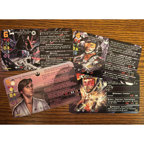 This pack features three heroes of the Rebellion: Luke, "Dutch", and Hol Okand. It also features the Sith Lord himself, Darth Vader. These four cards equip the official loadouts from the Battle of Yavin pack. All but the Luke card are reimagined by the excellent artist Kok Shen. The Luke art is from the talented portraitist Stephanie Keeline.